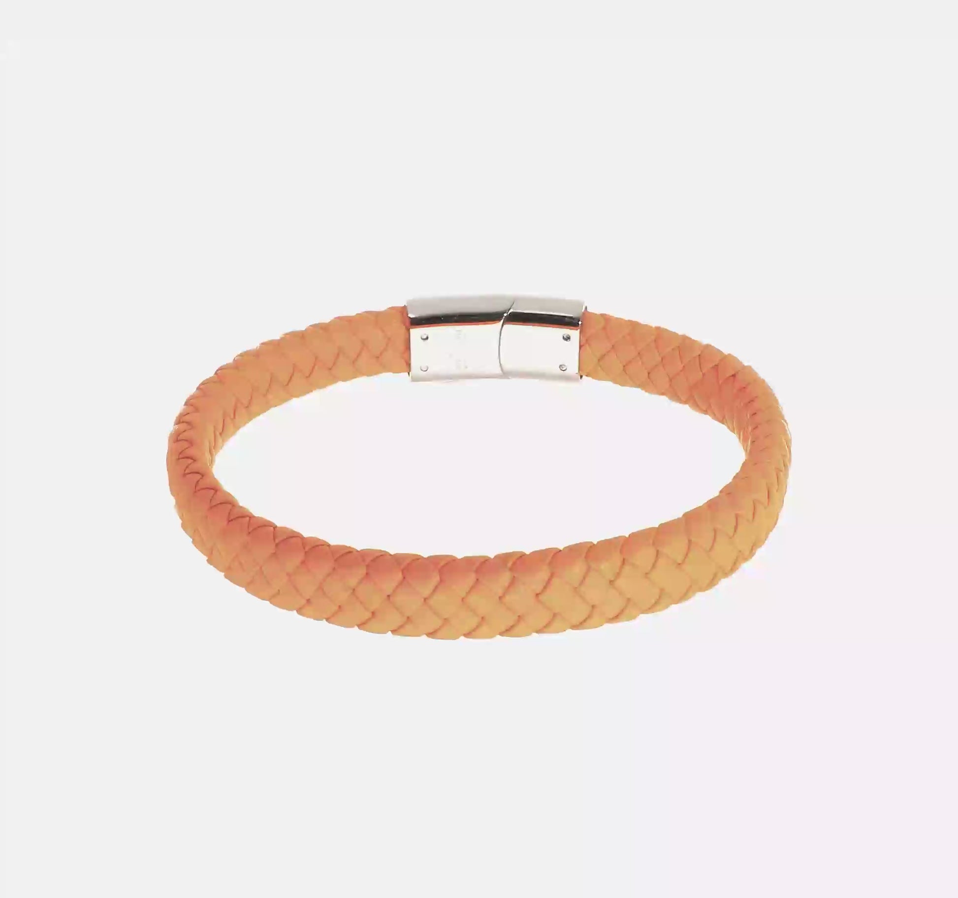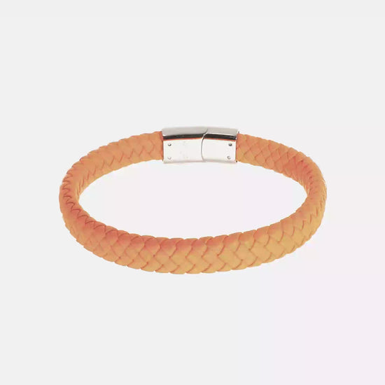 🔹 Right on the new trend! Brighten your look with this 8.25" woven trendy orange leather & Stainless Steel bracelet, designed for men who enjoy making a bold statement.